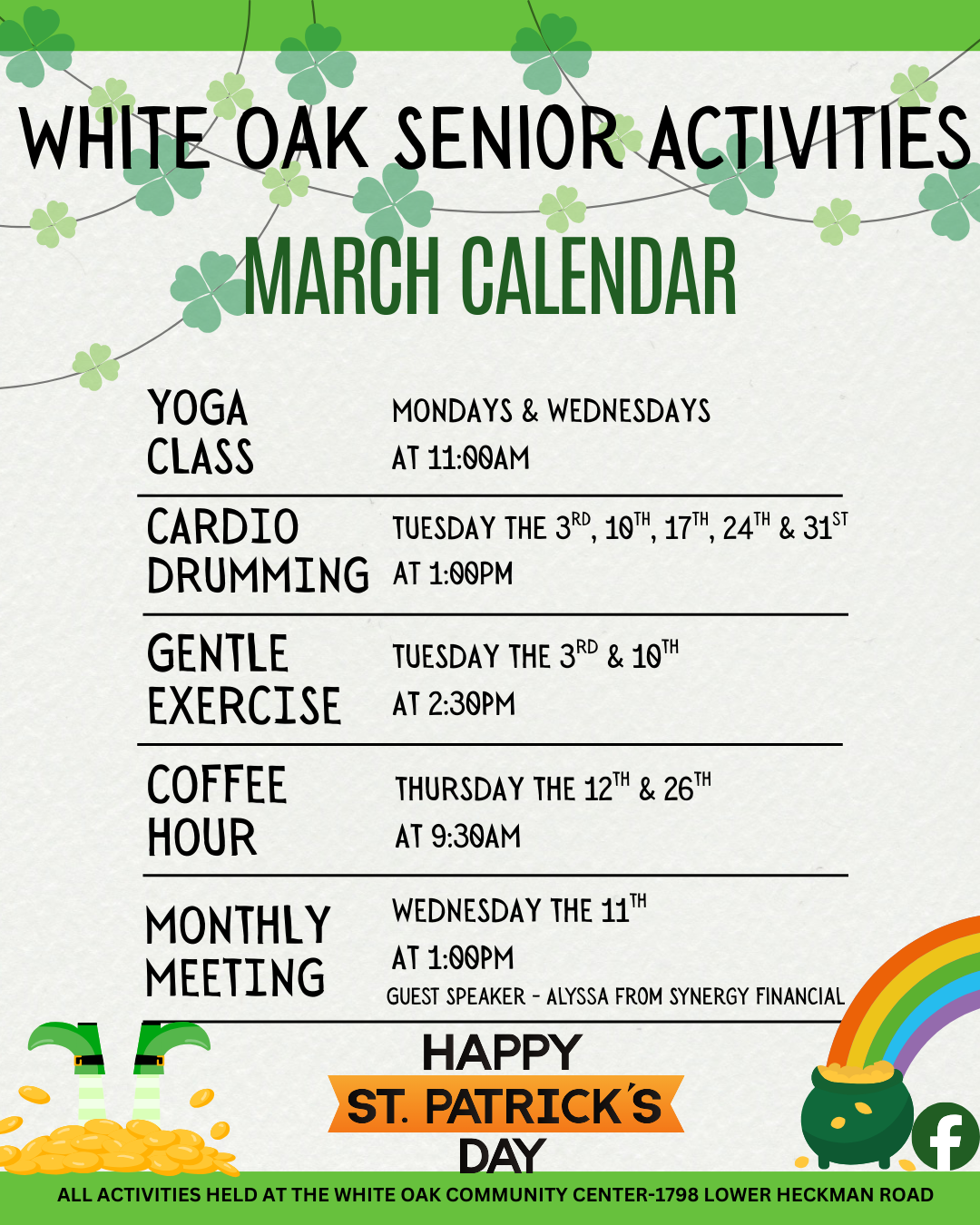 If necessary, the Recreation Board will meet the 2nd Thursday of each month (2/8, 3/14, 4/11, 5/9, 6/13, 7/18, 8/8, 9/12, 10/10, 11/14, 12/12) at of each month at 7:00 PM. Meeting for July was adjusted to the 3rd Thursday due to the 4th holiday.